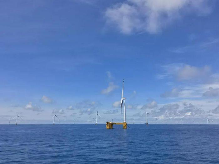 ▲ 矗立南海的全球首臺抗臺風型漂浮式海上風電機組“三峽引領號”